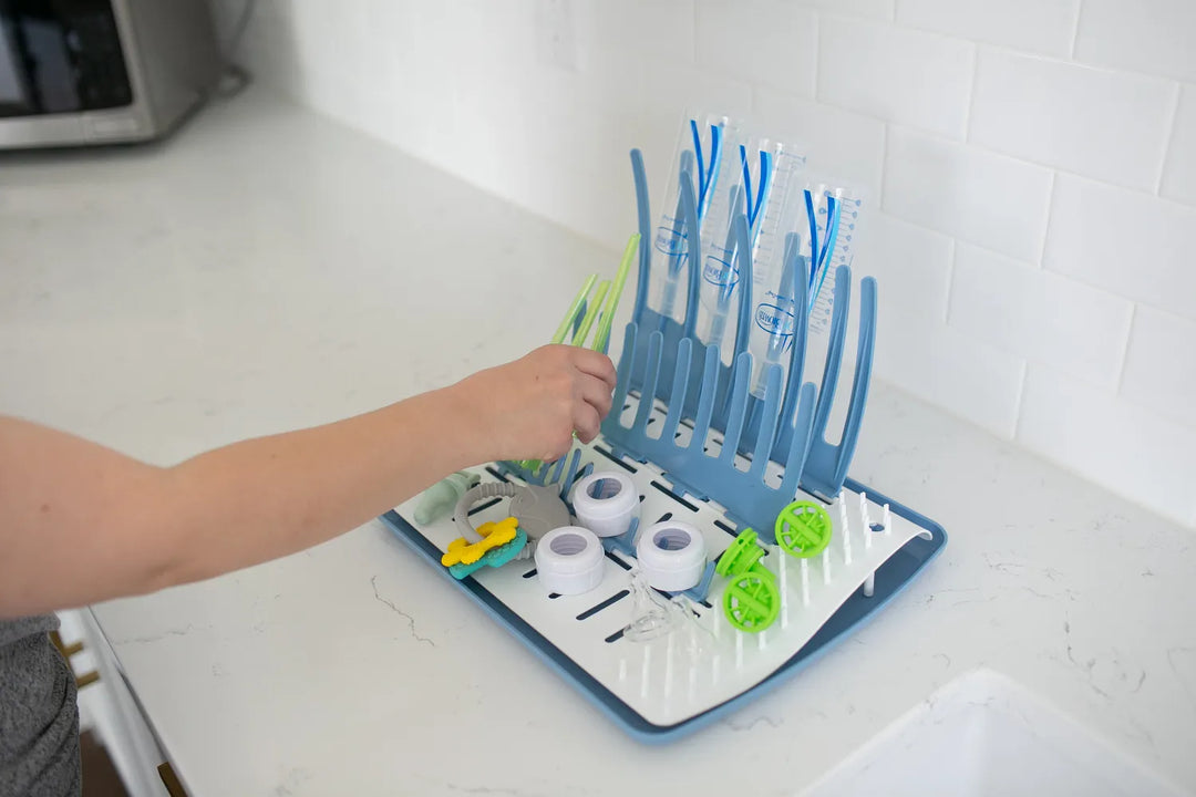 The Dr. Brown’s™ Folding Baby Bottle Drying Rack is there when you need it and easily stored when you don’t. The raised drying platform with water collection tray keeps your counters dry and holds multiple Dr. Brown’s baby bottles and most other brands, too. The universal design fits cups, bowls, pacifiers, teethers, and so much more! When you need the counter space, just fold it up and put it away. The drying rack is dishwasher (top rack) safe so cleaning it is a breeze.