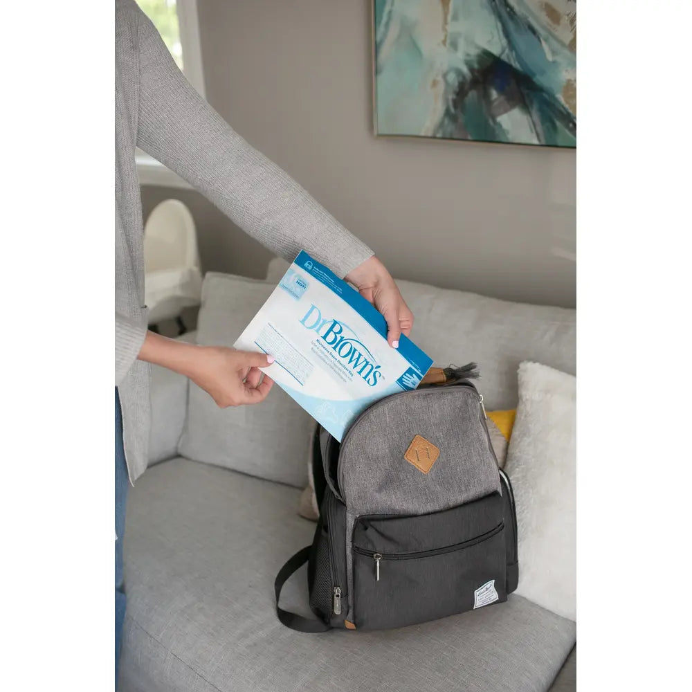 parts, multiple baby bottle parts, and all the necessary accessories because cleaning up on the go is easier than ever with Dr. Brown’s™ Microwave Steam Sterilizer Bags. With only a microwave and a little bit of water, you can quickly sterilize multiple bottles and pump parts, eliminating 99% of bacteria, mold, and the yeast that causes thrush. And with these multi-use bags, you’ll create less waste and save money.