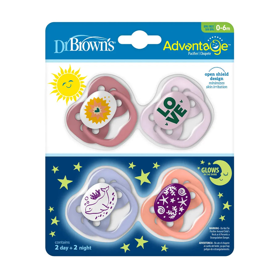 Dr. Brown’s™ Advantage™ Pacifiers, Lavender Love and Glow in the Dark Coral Ocean, 4-Pack